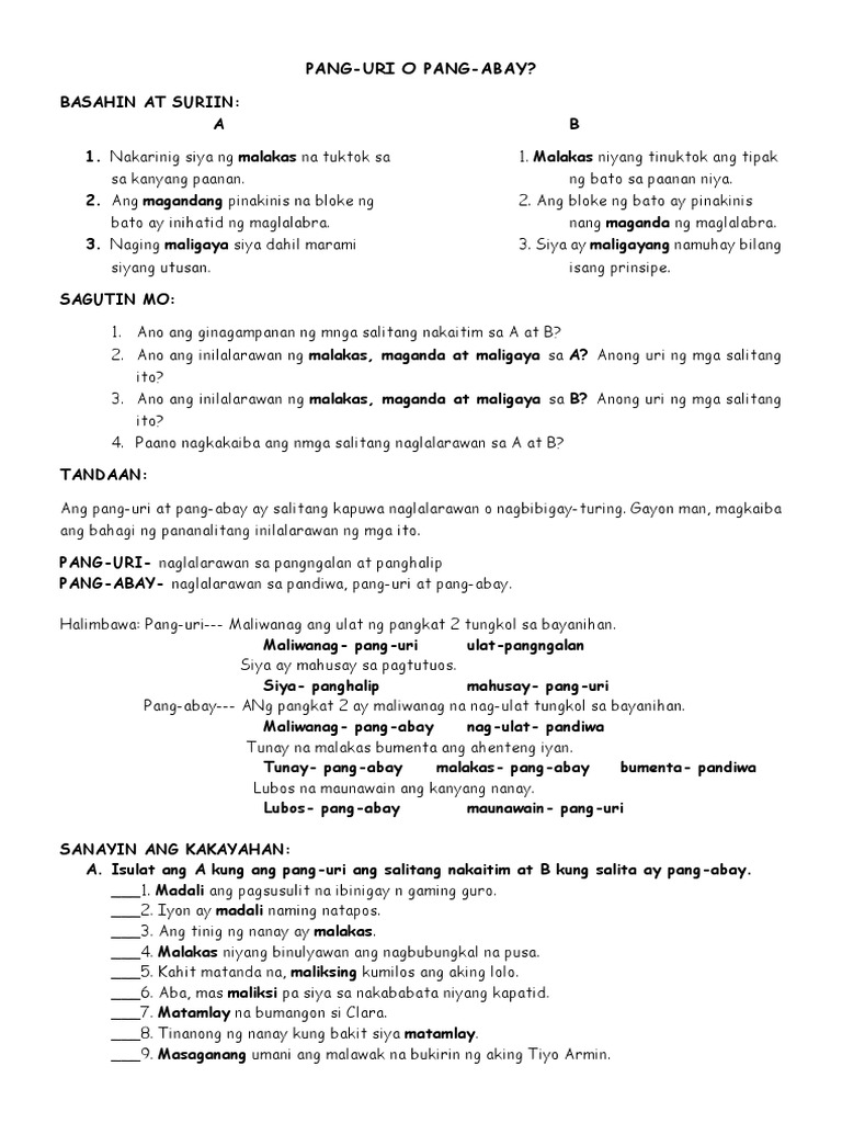 Tungkuling pagsikapan na mapangalagaan ang kaniyang diginidad at pagpapahalaga sa sarili at sa kapwa. Each adjective can be only used once. Kayarian ng Pang-uri Gaya ng pangngalan ang pang-uri ay may paraan upang mabuo.