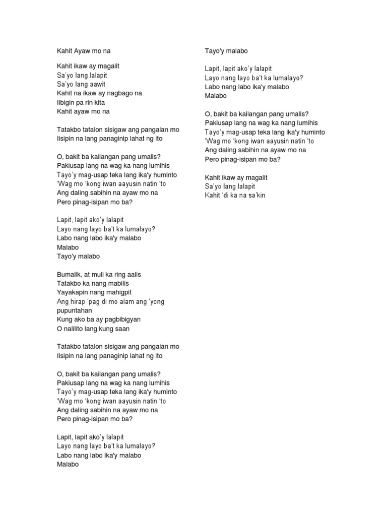 Oh bakit ba kailangan pang umalis. Labo nang labo ikay malabo malabo Oh bakit ba kailangan pang umalis. Tatakbo tatalonSisigaw ang pangalan moKahit Ayaw Mo Na guitar coverJanuary 24 2019Luh takip tainga sa boses at sa tono ng gitara. Tatanungin Para hinde mo na kailangan pang umamin OK lang ako OK.